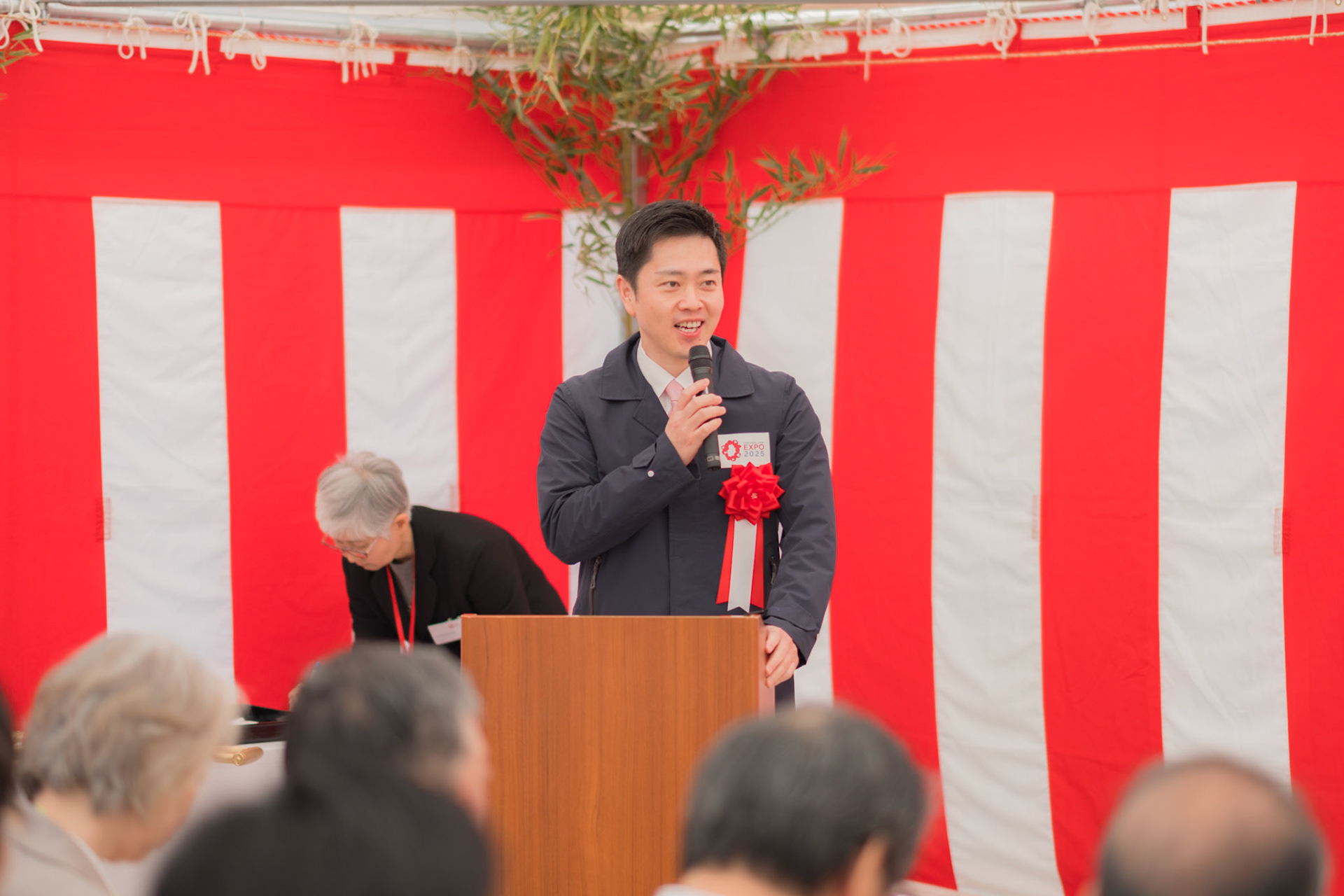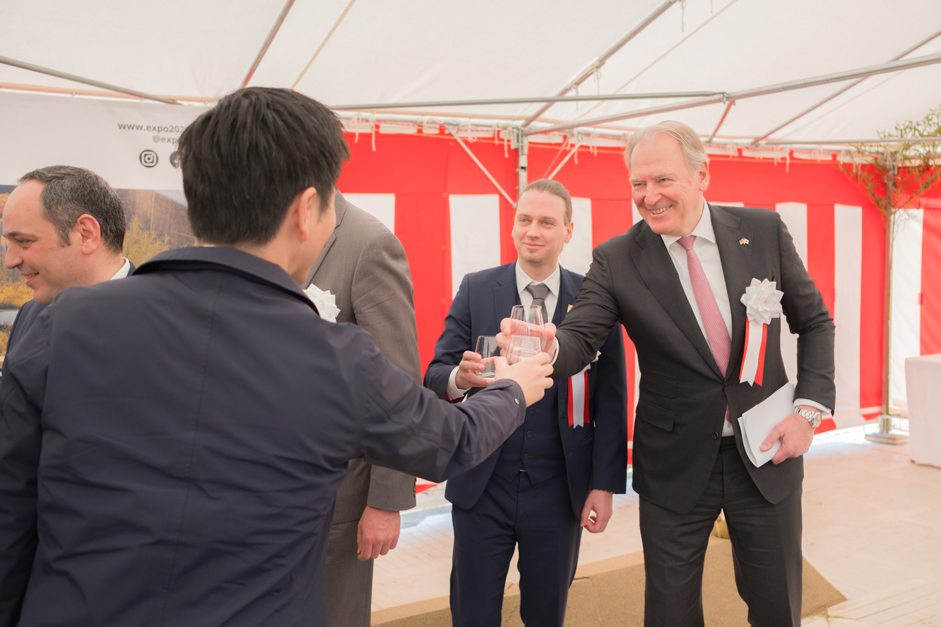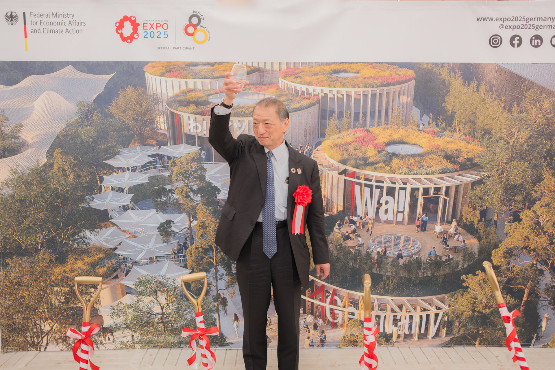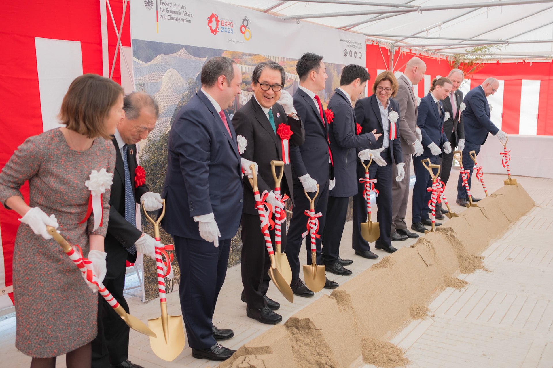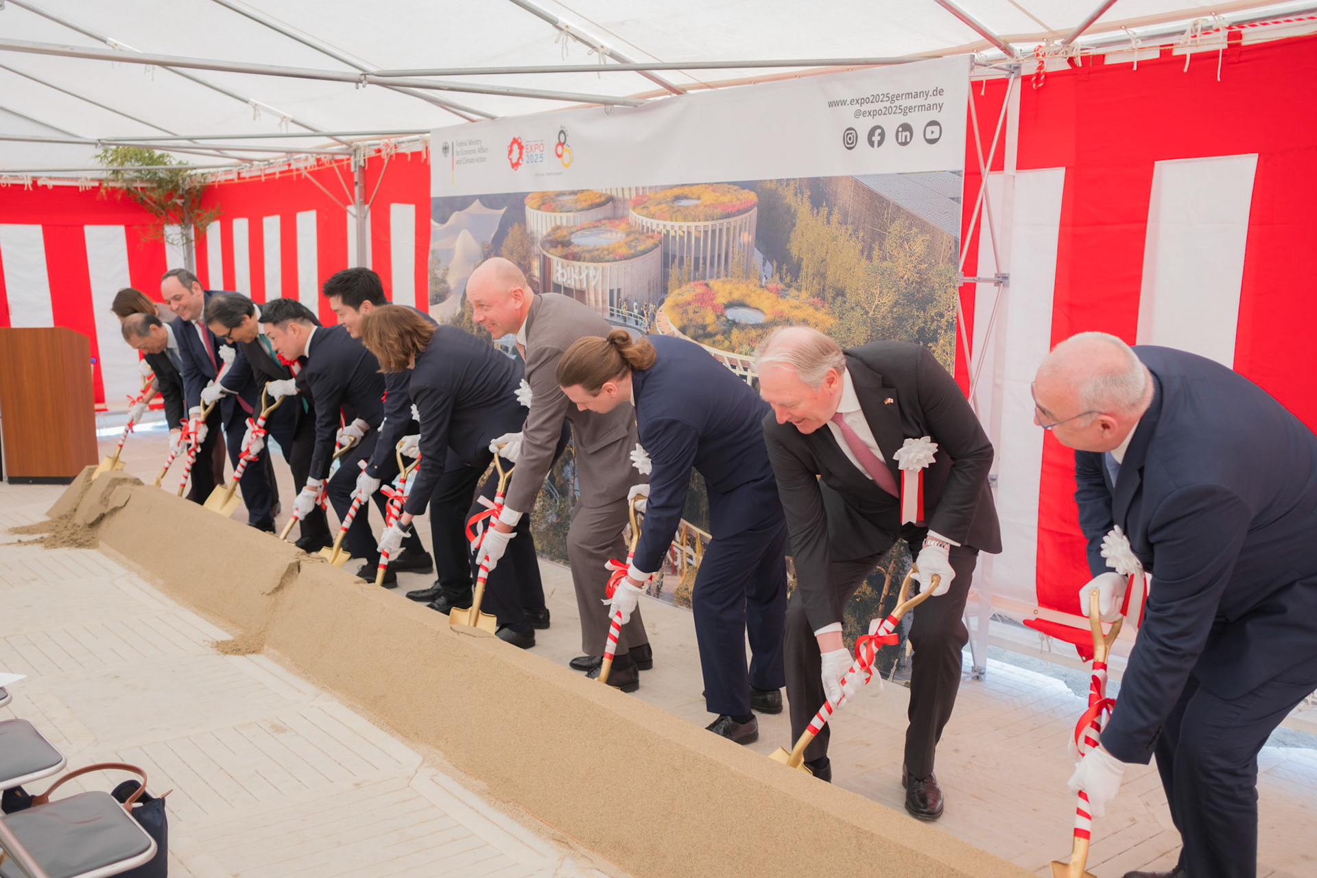 The groundbreaking event ceremony for the 2025 German Pavilion in Osaka, Japan, marked by the presence of distinguished guests, including Osaka Mayor Mr. Hideyuki Yokoyama (横山 英幸さん), Osaka Governor Mr. Hirofumi Yoshimura (吉村 洋文さん), and Ms. Melanie Saxinger, Consul General of the Federal Republic of Germany in Osaka.