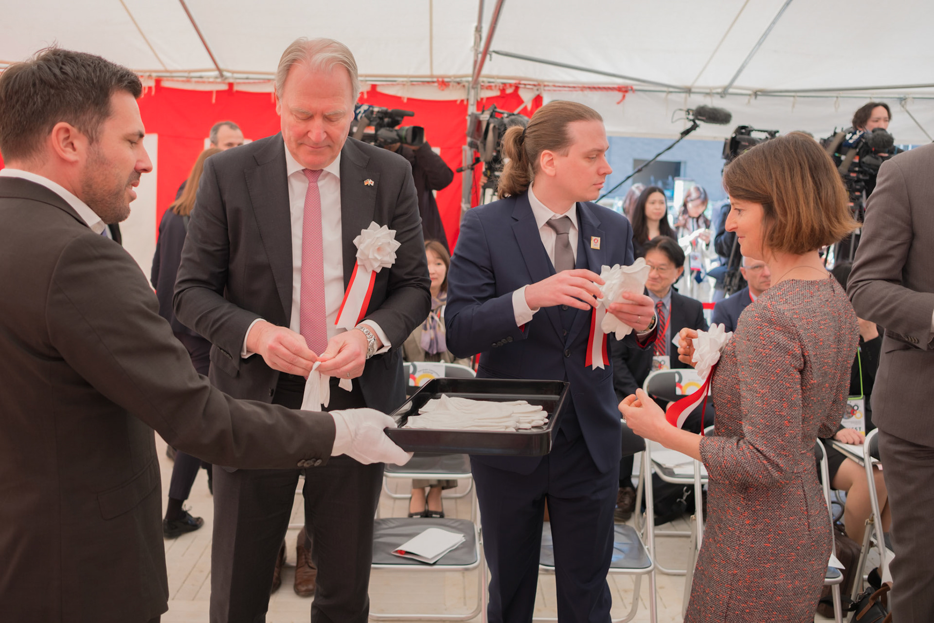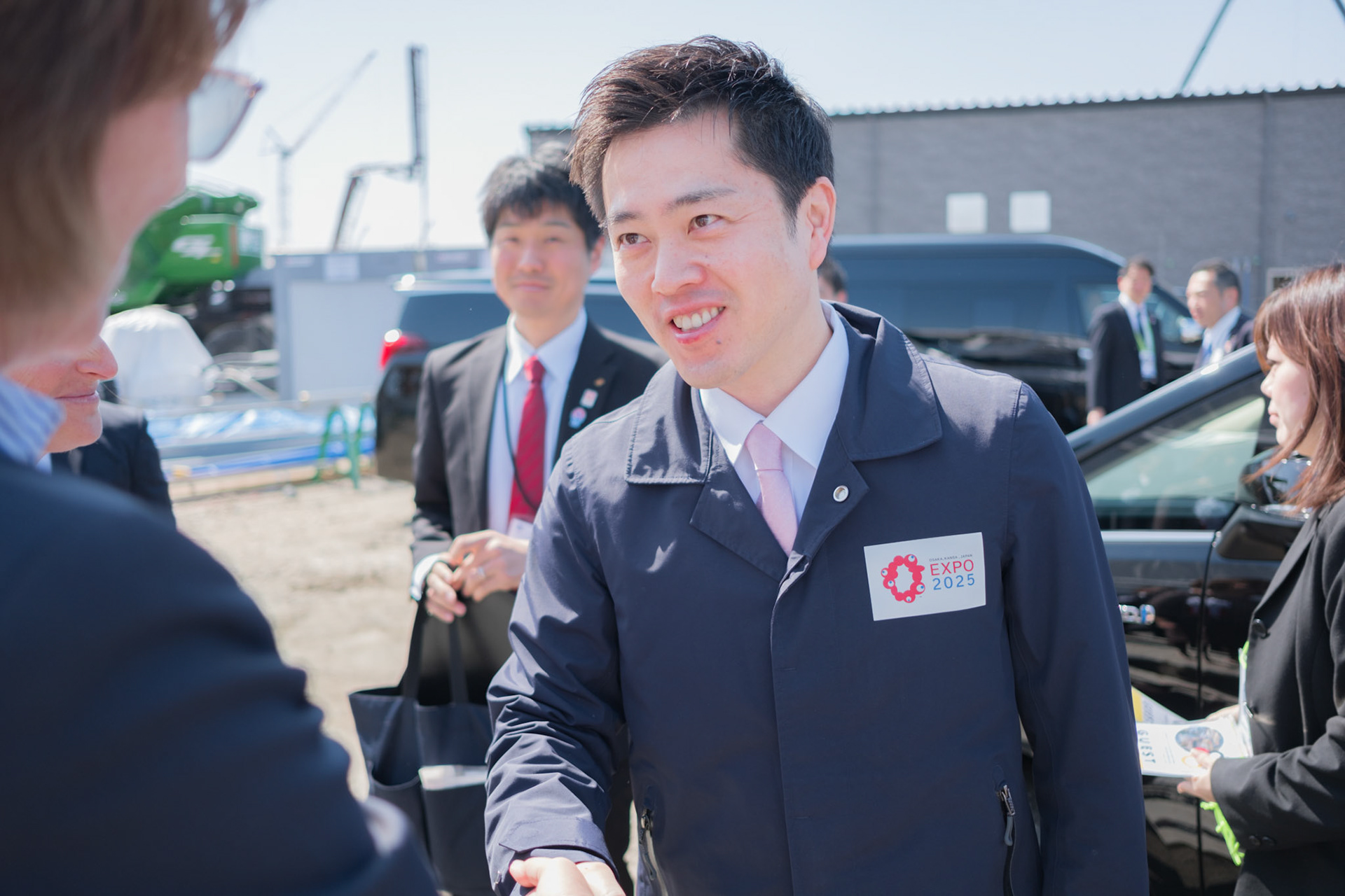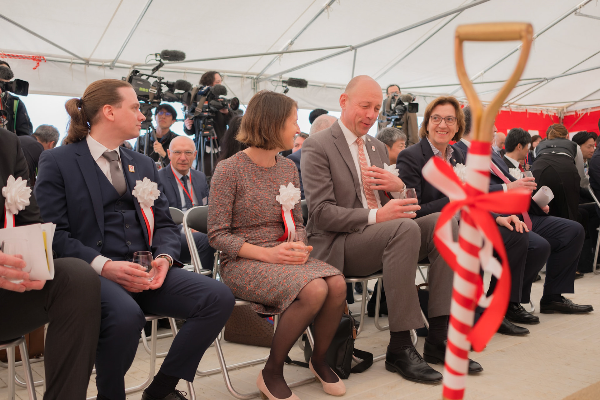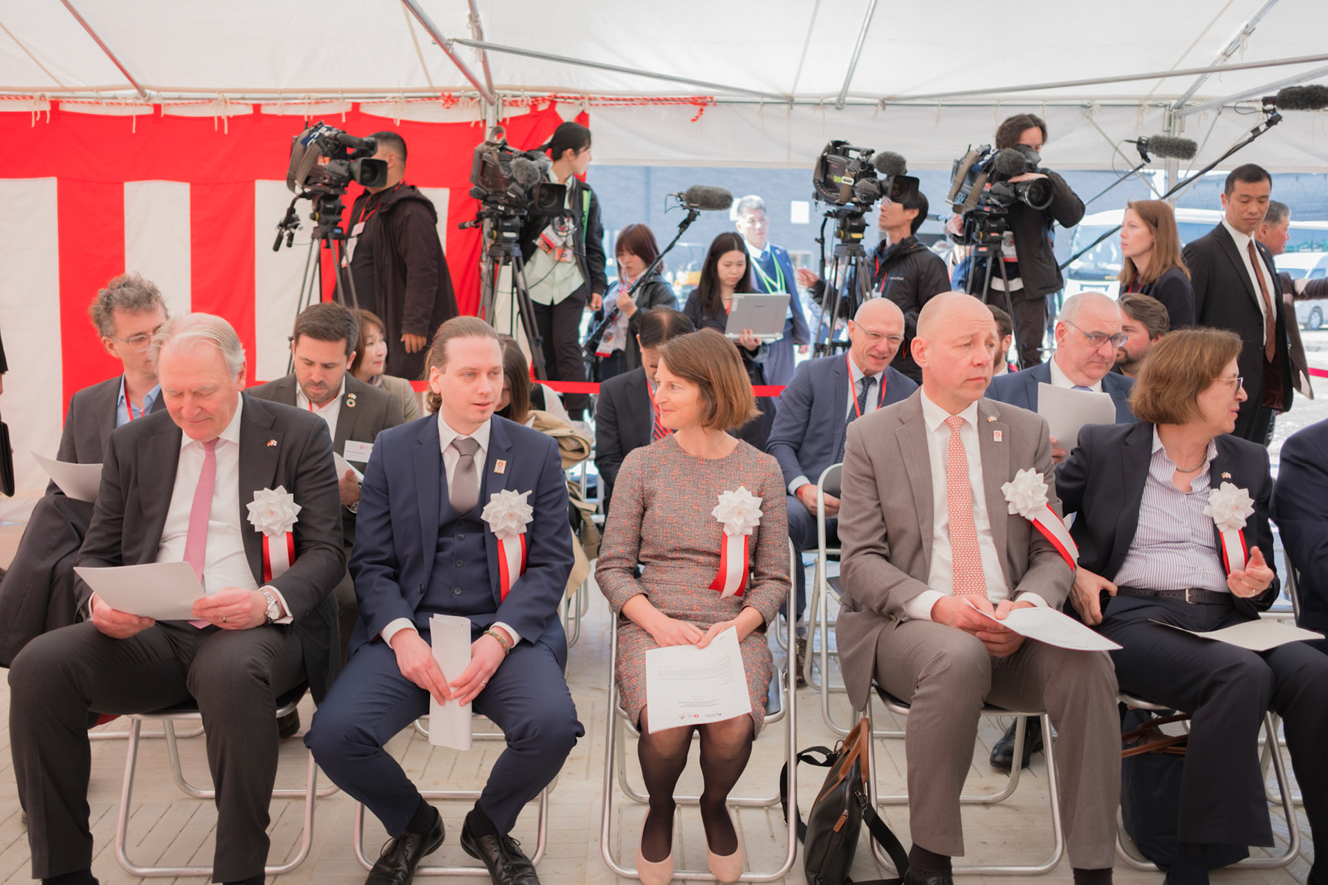 The groundbreaking event ceremony for the 2025 German Pavilion in Osaka, Japan, marked by the presence of distinguished guests, including Osaka Mayor Mr. Hideyuki Yokoyama (横山 英幸さん), Osaka Governor Mr. Hirofumi Yoshimura (吉村 洋文さん), and Ms. Melanie Saxinger, Consul General of the Federal Republic of Germany in Osaka.