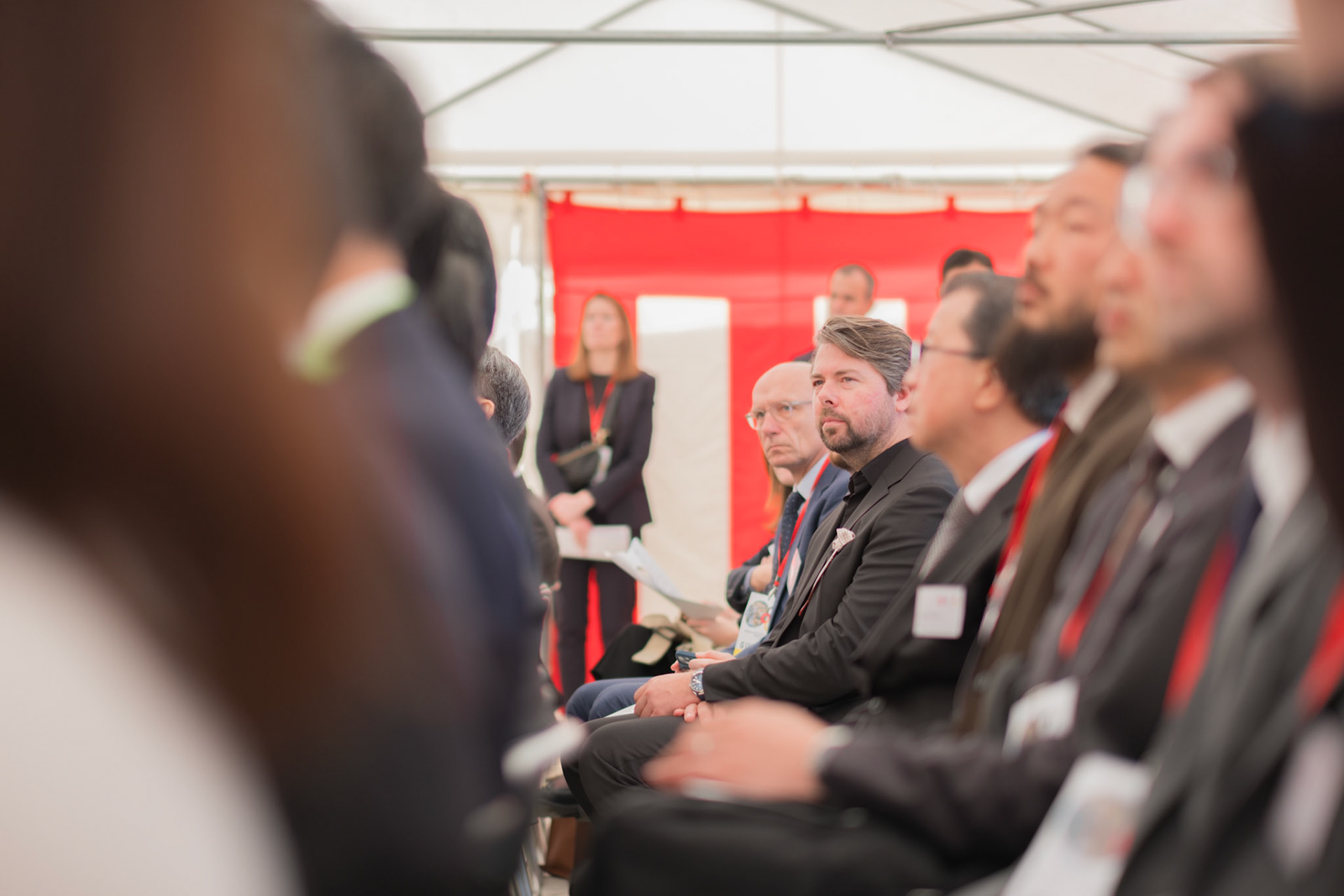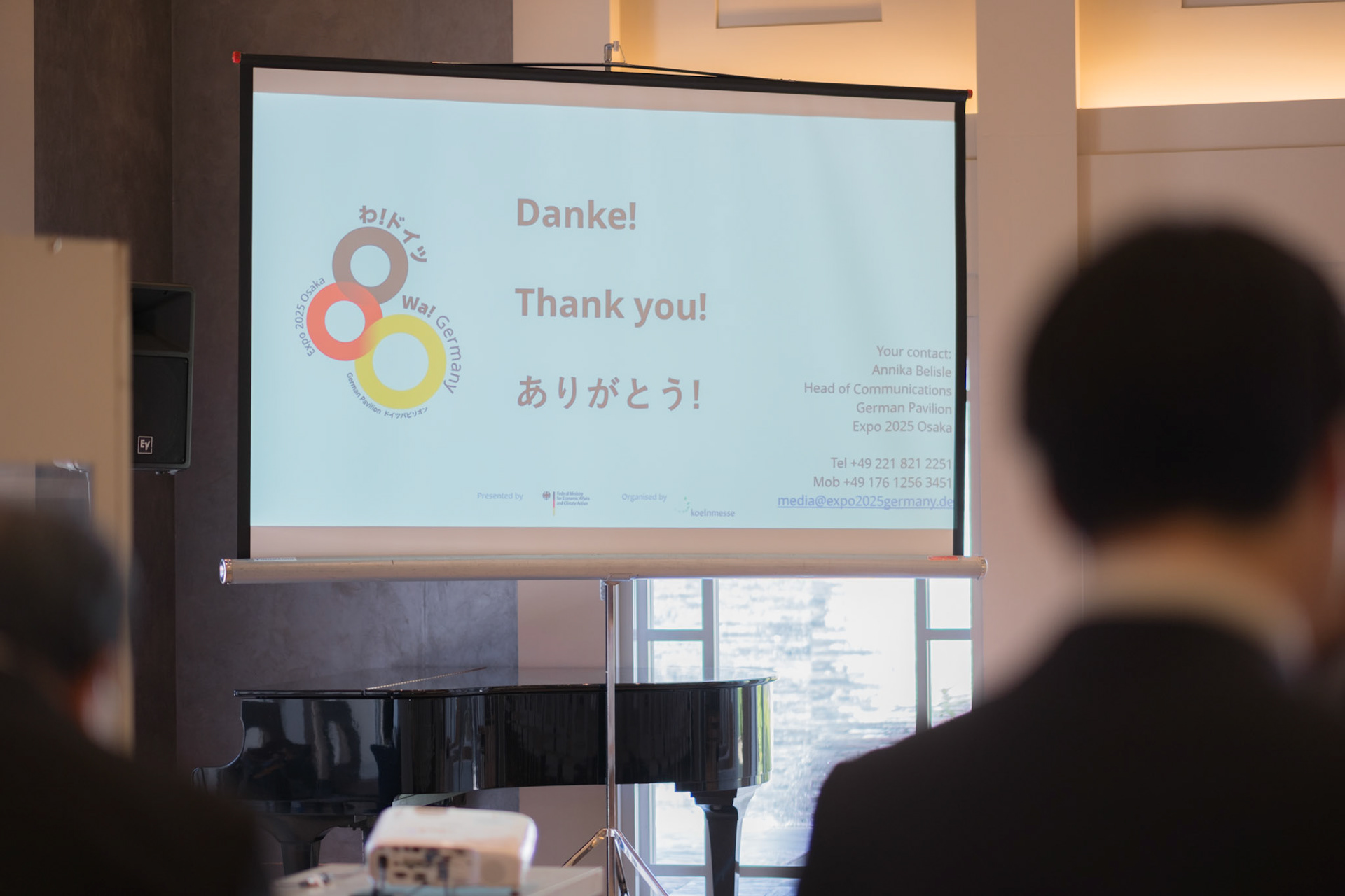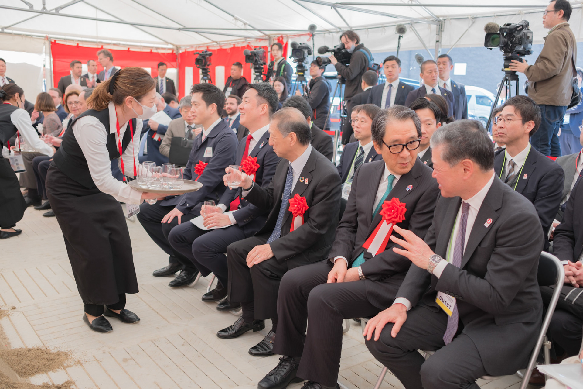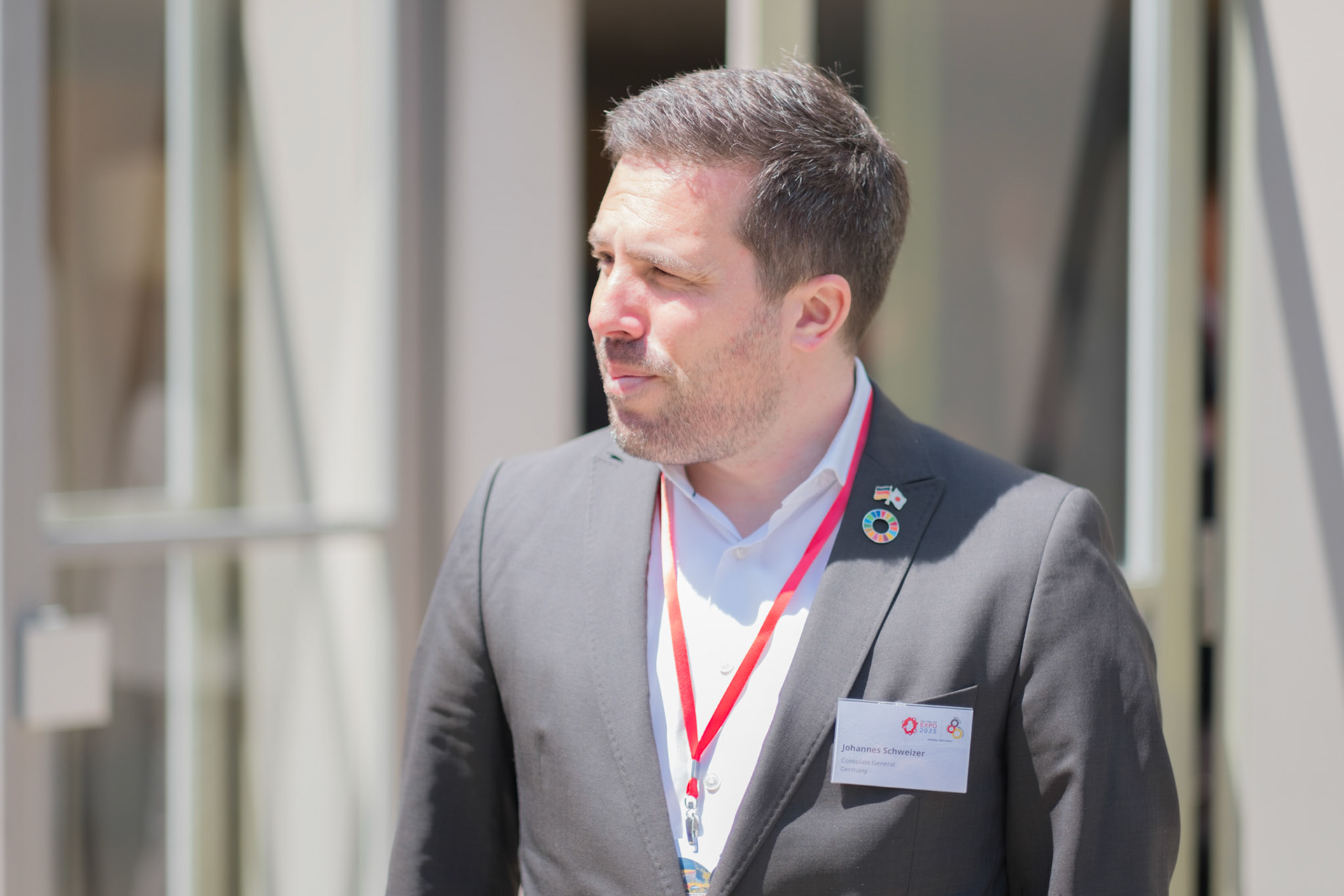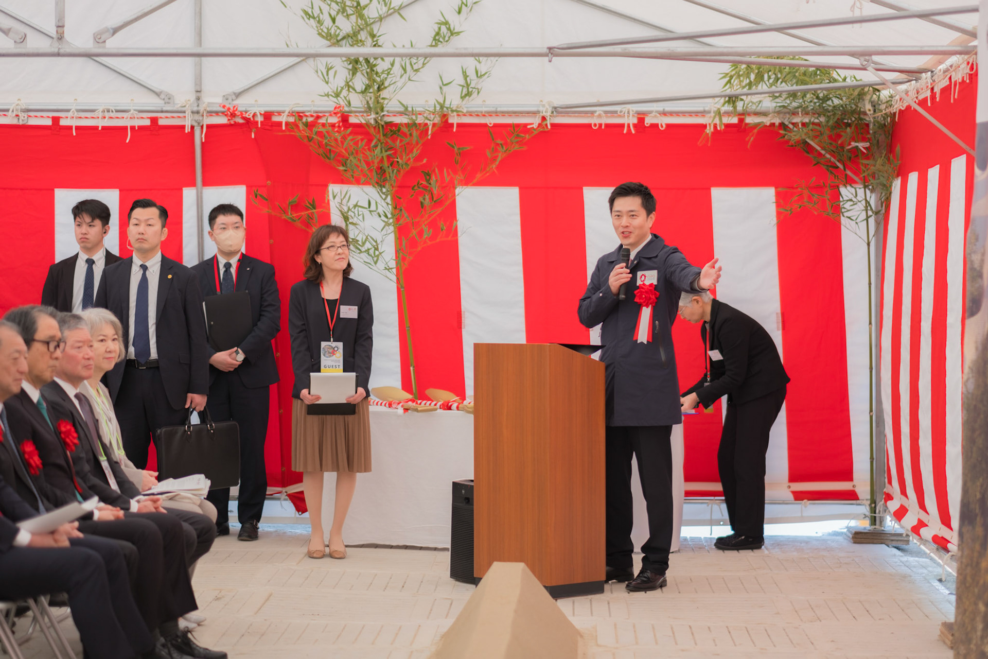 The groundbreaking event ceremony for the 2025 German Pavilion in Osaka, Japan, marked by the presence of distinguished guests, including Osaka Mayor Mr. Hideyuki Yokoyama (横山 英幸さん), Osaka Governor Mr. Hirofumi Yoshimura (吉村 洋文さん), and Ms. Melanie Saxinger, Consul General of the Federal Republic of Germany in Osaka.